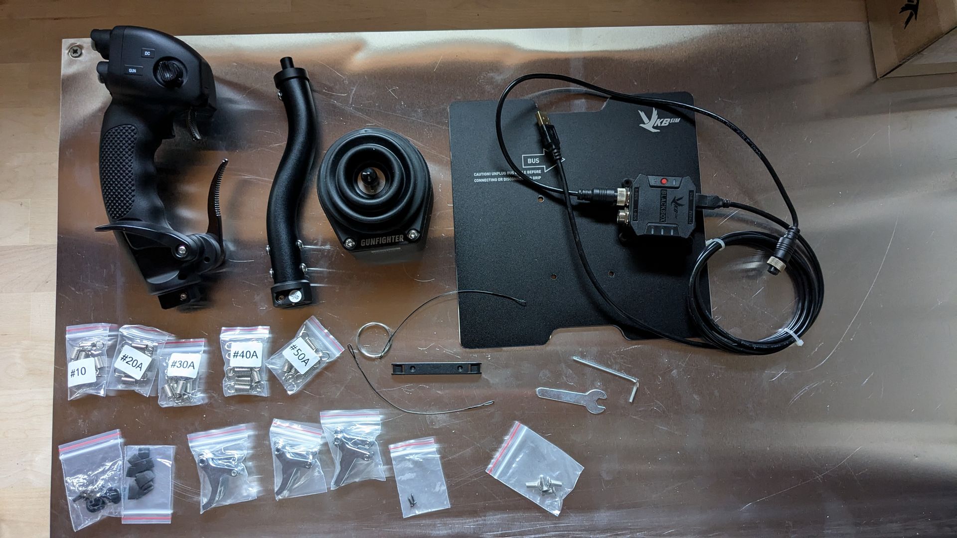 Der VKB Gunfighter hat eine Mechanik, die getrennte Federkraft zur Rückmeldung je Achse auf Querruder und Höhenruder aufweist. Gegenüber anderen Modellen, die mit zentraler Feder auf ein Kugelgelenk arbeiten, wie zB der Warthog Hotas ist der klare Vorteil, dass die Rückmeldekräfte je ausgelenkter Achse spürbar sind.